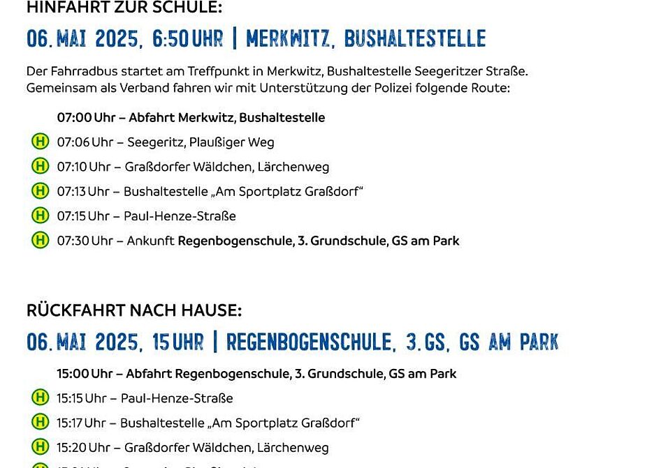 Am 6. Mai 2025 beginnt die neue Saison für unsere Fahrradbus-Aktion. Wir, die Klimainitiative, Verkehrswende Leipzig und der ADFC Leipzig Ortsgruppe Taucha, laden alle Schülerinnen und Schüler ein, gemeinsam mit dem Fahrrad zur Schule zu fahren. Wir treffen uns in Merkwitz und radeln nach Seegeritz, vorbei am Graßdorfer Wäldchen und Cradefeld auf der Graßdorfer Straße in Richtung der Schulen. Sprecht eure Freunde an und kommt mit. Wir fahren gemeinsam und die Polizei begleitet uns.