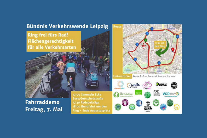 Ring frei für den Radverkehr! Gemeinsam rufen wir mit 18 Leipziger Initiativen am 7. Mai 2021 für mehr Platz fürs Rad, sichere Radverkehrsanlagen und eine zeitgemäße, umweltfreundliche Mobilität auf. Wir sind viele und fordern mehr Mut und Tempo!