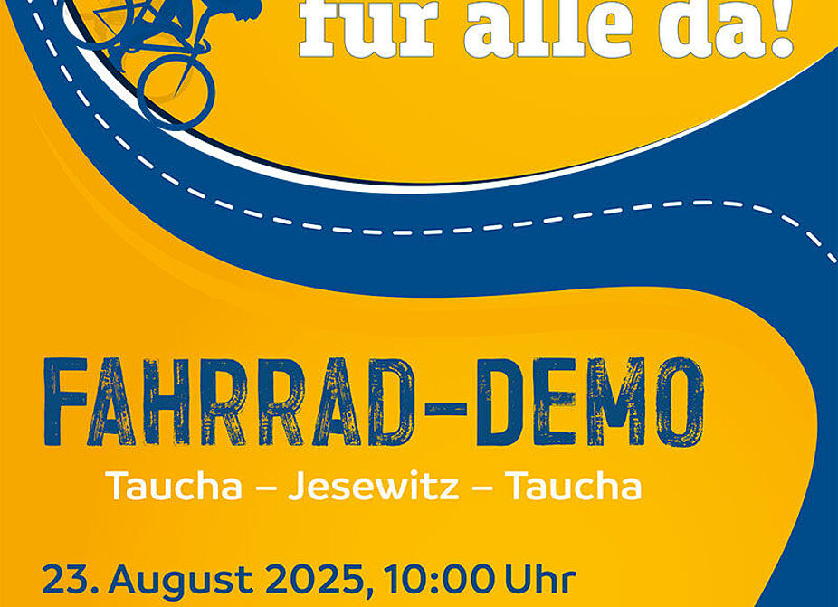Am Samstag, dem 23. August 2025 beginnt in Taucha das STADTRADELN. Auftakt ist eine Fahrrad-Demonstration zwischen Taucha und Jesewitz. Unser Motto lautet "Straßen sind für alle da" – seid mit dabei!