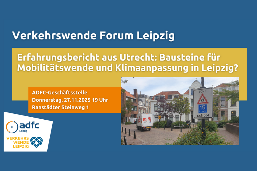 Vortrag im November: Erfahrungsbericht Radverkehr in Utrecht – Bausteine für Mobilitätswende und Klimaanpassung in Leipzig? Bildervortrag mit inhaltlichen Inputs für interessierte Laien sowie Fachkundige. Utrecht ist ein europäischer Leuchtturm in puncto Fahrradfreundlichkeit. Die Stadt wirkt gegenüber Leipzig so manchem Radbegeisterten um Meilen voraus. Doch die (fortlaufenden) Entwicklungen andernorts sind nicht vom Himmel gefallen. Wie kam es also zu der Pionierstellung? Was können wir uns abschauen? Und wie kann jede*r Einzelne die Sache weiter vorantreiben? Felix Klickermann (UFZ) hat im Rahmen einer Dienstreise 2025 die Stadt Utrecht auf seinen Arbeits- und Freizeitwegen insbesondere mit dem Rad erkundet. Dabei machte er sich ein Bild von Verkehrslösungen und der urbanen Klimaanpassung vor Ort.