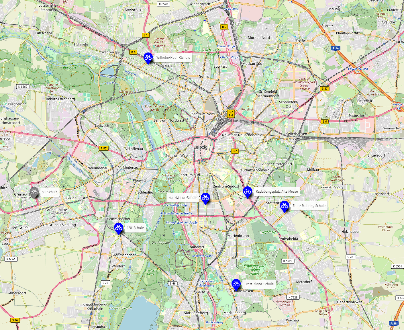 interaktive OpenStreetMap-Karte der Fahrradübungsplätze in Leipzig